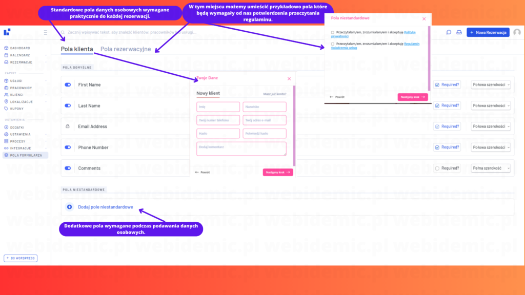 W tym miejscu ustawia się pole formularza danych osobowych. Formularz pomaga uzupełnić niezbędne dane do rejestracji i rezerwacji. Poniżej przedstawiono prawidłowo wypełnione opcje. Nie zaleca się zmiany.