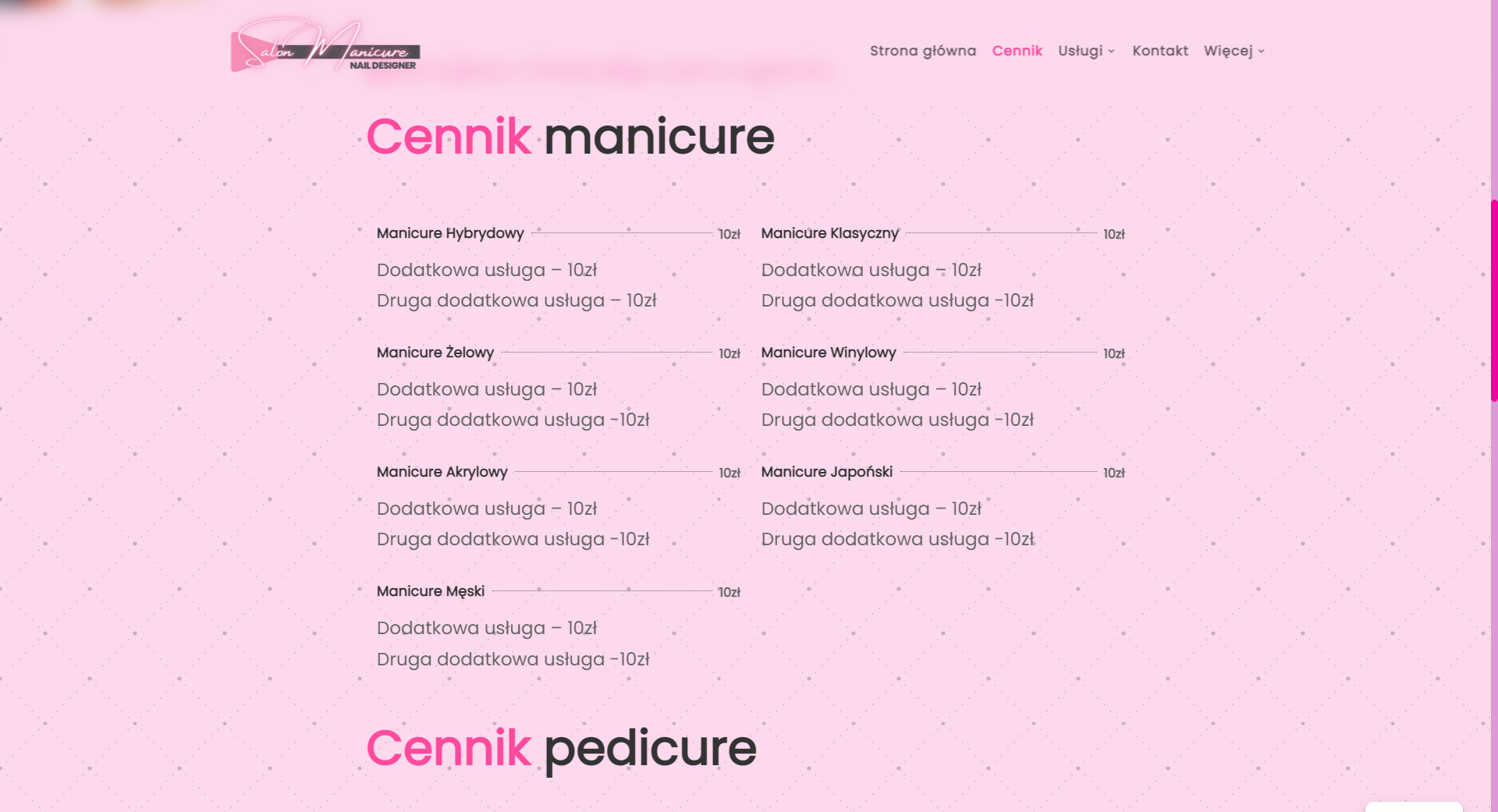 Ten szablon został wypełniony przykładowymi treściami gotowymi do użycia. Po małych modyfikacjach (adresy i dane salonu) strona będzie gotowa do promowania oferty. Dodatkowo zostały utworzone treści opisowe usług typowych dla salonu manicure. Po drobnych modyfikacjach również gotowe w krótkim czasie do użytku.